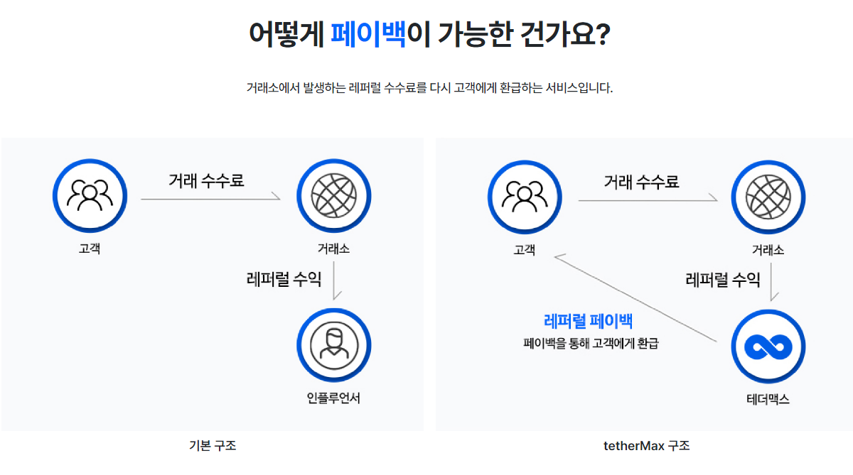 사진을 보면 일반적인 기본구조와 테더맥스 구조를 비교해 보면 한눈에 이해가 된다. 기본구조는 고객이 거래소에 거래수수료를 내고 레퍼럴 수익을 인플루언서에게 지급되지만, 테더맥스는 거래 수수료가 생기면 거래소에서 테더맥스에게로 레퍼럴 수익이 지급되고 그대로 고객에게 레터럴 바이백을 해주는 시스템이다. 즉 거래소에서 발생된 레퍼럴 수익을 바로 고객에게 환급해주는 서비스다.