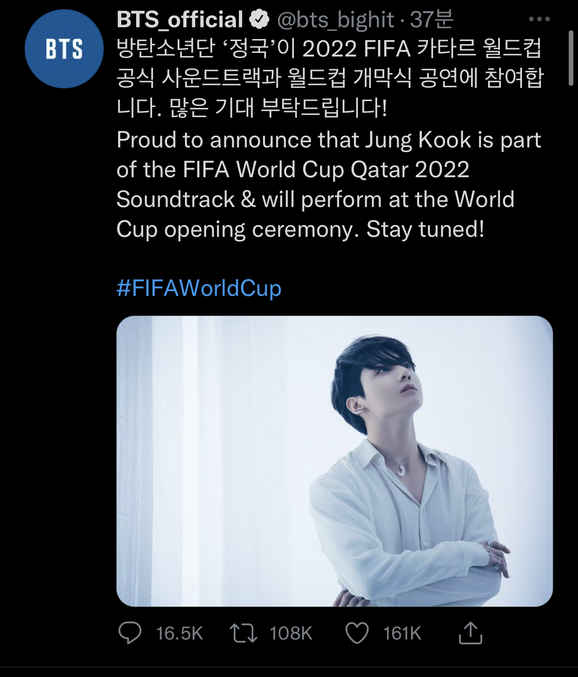 그리고 조금 전 BTS 방탄소년단 정국이 2022 FIFA 카타르 월드컵 개막식 공연이 참여한다는 내용이 BTS 공식 트위터 계정에 올라왔다.